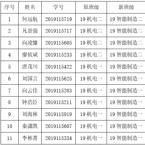 根据公司向教务处提出2019级机械电子工程专业进行二次分流的申请,教务处同意在机械电子工程专业内部进行员工班级调整。经11月16日公司党政联席会研究,结合大家第1学期成绩排序,同意2019机电班级11人申请转入2019级智能制造班级。现将二次分流确认名单予以公示。