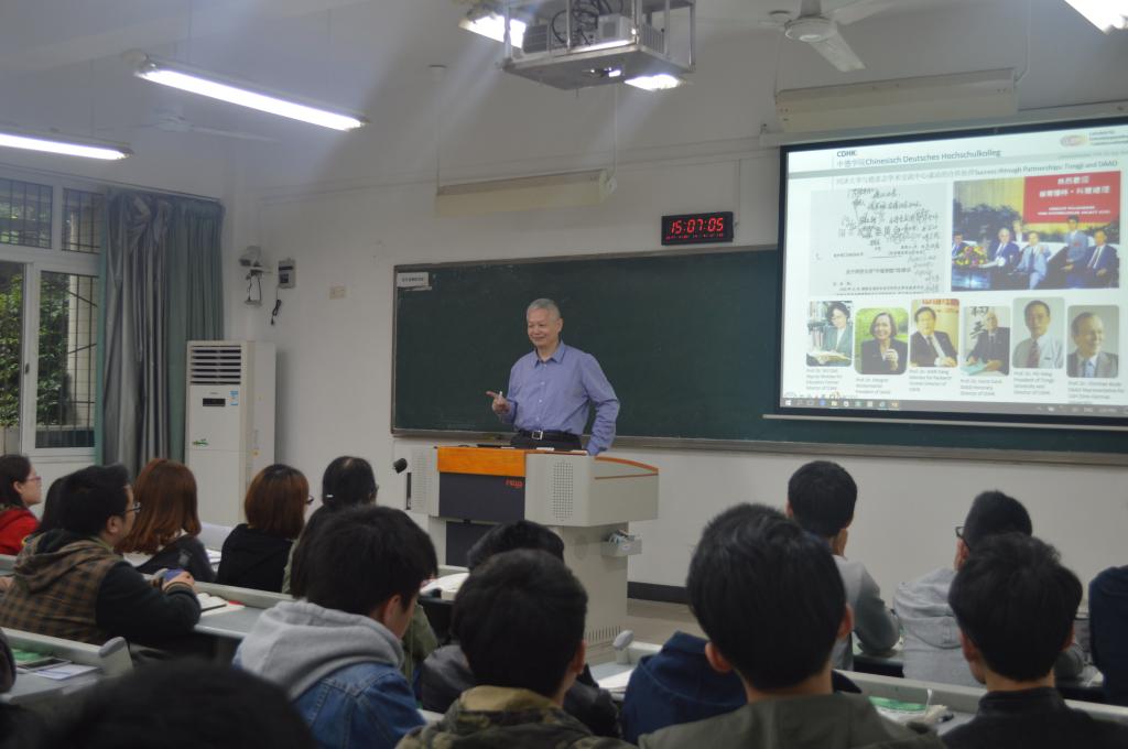 林松教授结合自己在德国近18年的教学和科研经历,详细阐述了德国工业4.0的背景、概念及其实现的条件和途径。然后从产品研发的基本方法和产品研发模式两个方面对德国工业4.0背景下的产品研发创新理念进行了介绍。讲座过程中,林松教授严谨的逻辑思维和环环相扣的讲解,结合开放创新的应用实例,将同学们带入了“一片科技的海洋”。互动环节中,同学们踊跃地向林教授请教,林松教授也以深入浅出的方式为同学们答疑解惑。