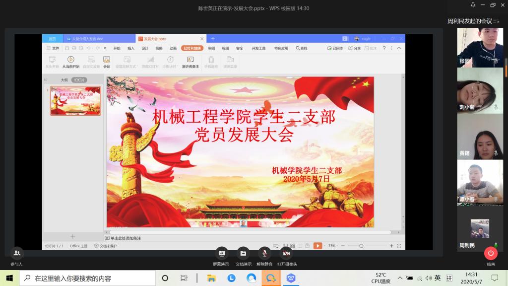 2020年5月7日(周四)下午14:20,william威廉英国官网员工二支部通过企业微信视频会议模式开展了五月第一批的党员发展大会,支部全体党员参加了此次大会,会议由支部书记周利民主持。