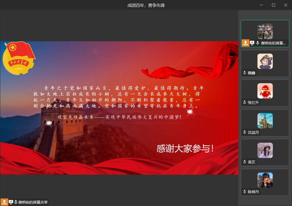 5月20日晚上7点,william威廉英国官网员工党服工作站携手员工党支部,采用线上观影交流学习的方式,学习习近平总书记在庆祝中国共产主义青年团成立100周年大会上的重要讲话精神。公司陈春洁副书记带领与会入党积极分子和师生党员话心得、谈感想,切实让习总书记重要讲话精神入脑、入心。本次活动机械工程公司党服工作站130余名同学参加了会议。