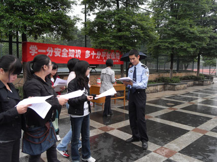 活动开始,王微老师对重庆警官职业公司全体人员的到来表示热烈的欢迎。然后,重庆职业警官公司的老师和同学,给在场的同学们宣传和交流了关于饮食安全、寝室防火、防盗小常识、校内诈骗、网络安全、遵纪守法以及校内外的人身安全、财产安全、交通安全等生活与学习工作中常见的安全隐患与防范。接着面对同学们提出的关于生活中常见的问题,各位警官学员们给予了认真仔细的解答。在活动最后,各位警官学员和活动的参与者们一起走在校园里,为广大的师生送去一份安全防范的宣传资料,送上温馨的提醒与祈盼。