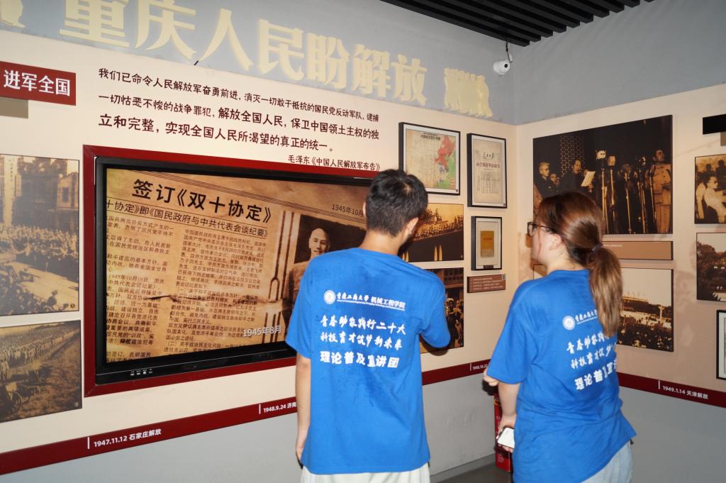 第一站,理论宣讲团成员来到南泉革命烈士陵园,缅怀因革命事业而牺牲的革命先辈。被庄严肃穆的气氛所感染,宣讲团成员屏息凝神,浏览过墓碑上一个个烈士姓名,接受思想上的洗礼。第二站,经过艰难的攀爬,宣讲团成员到达解放重庆历史陈列馆,在鲜红的旗帜前庄严宣誓。缓行馆内,一件件陈列在柜中的旧物将过去的历史重现于眼前,这些历史文物见证了那个时代的艰辛和伟大,也引领宣讲团成员深刻感受到了先烈们的无私奉献和牺牲精神。
