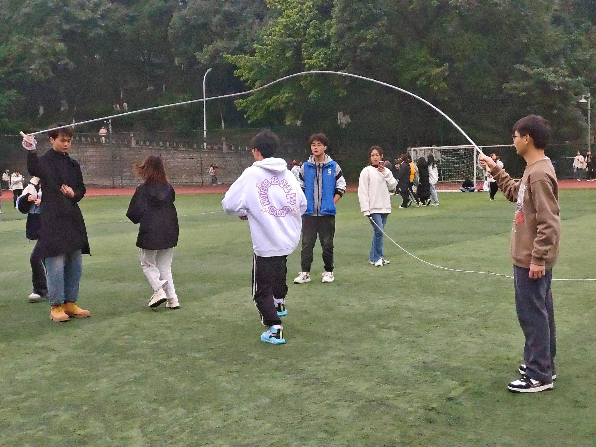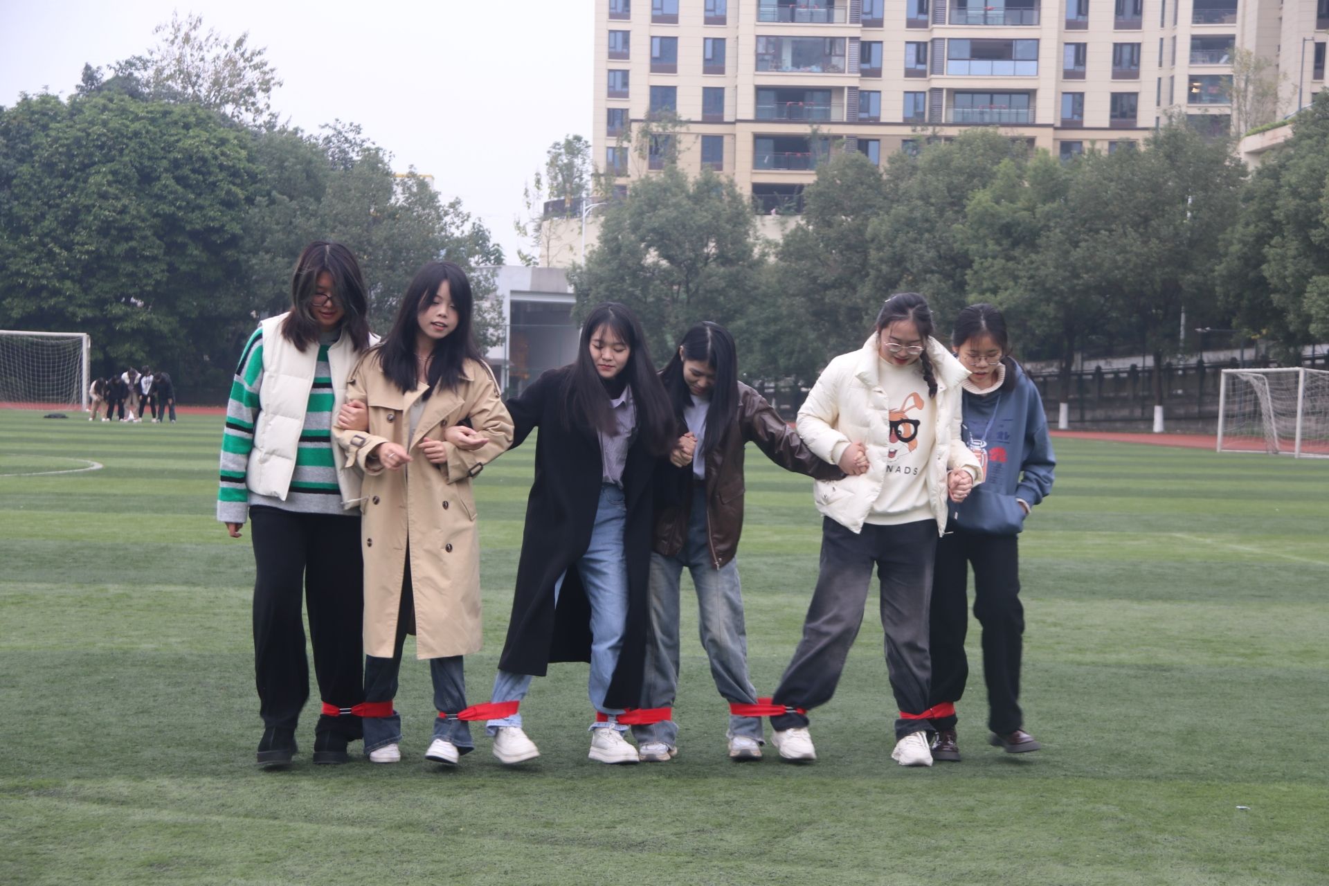 伴随着工作人员热情洋溢的开场白,趣味运动会正式拉开帷幕。各个项目参赛人员有序入场,在各自的比赛场地内蓄势待发。比赛正式开始,三个项目同时进行,履带竞速组的同学们全力以赴,争分夺秒,每支队伍都展现出来极高的竞技水平和团队协作精神;魔力转圈组的选手同样默契十足,姿态优雅,弧线优美;螃蟹运球组高度考验肢体配合,参赛队员稳扎稳打、不急不躁,均顺利抵达终点。下半场比赛继续,指压板跳绳备受瞩目,随着裁判员一声令下,参赛选手们快速挥动跳绳,承受着这直击心灵的痛感,真正意义上诠释了痛并快乐着这一句话;与此同时,团体8字跳绳和五人六足比赛也正如火如荼地进行,队员们精妙的配合迎来一阵阵欢呼,整个运动会场热血沸腾。