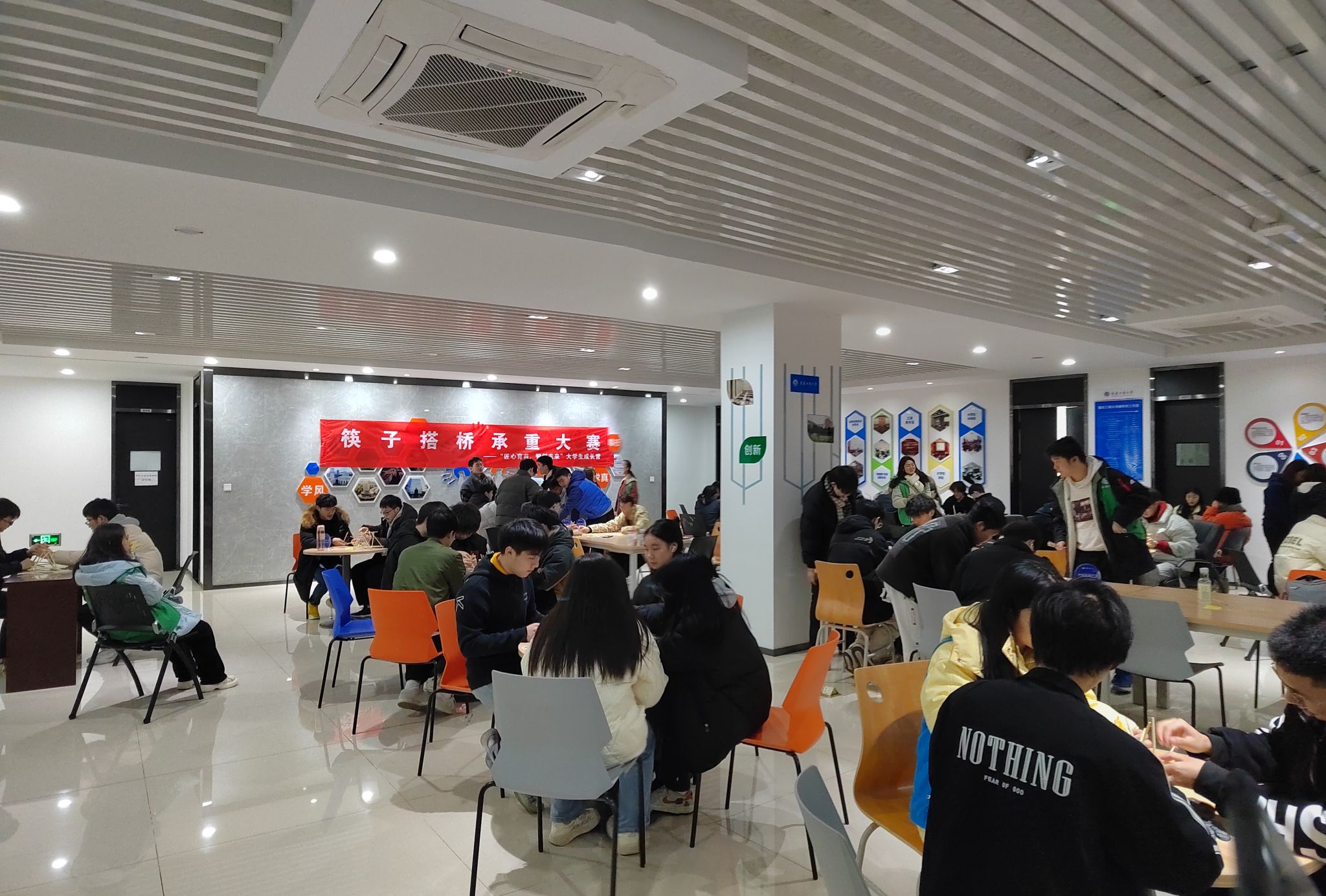 下午2时,“筷子搭桥承重大赛”在员工发展中心大厅拉开帷幕,共34支跨专业队伍参与。各参赛小组在有限时间内利用橡皮筋与筷子构建承重结构,并接受以瓶装矿泉水为单位的逐级加载测试。比赛中,同学们不断尝试、调整与优化结构方案,充分体现了专注思考、团队协作与精益求精的“工匠”精神。经激烈角逐,第2组与第17组分别以98瓶与60瓶的优异成绩荣获一等奖,另有10支队伍分获二、三等奖。