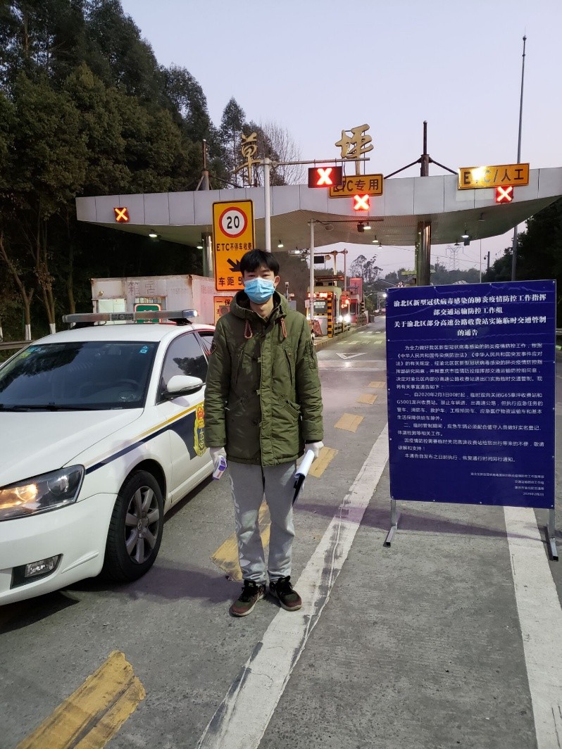 “人的一生总要做一些有意义的事情,为疫情防控贡献出自己的力量。”来自17级机制四班的颜佳良同学报名参加重庆市渝北区古路镇防疫工作,从1月31日开始,每天早上9点到达防疫站点,开始为过往车辆进去体温测量登记,返程高峰一天登记车辆多达四五百辆。至2月4日高速收费站封路,防疫站点转移到收费站,给特殊车辆进去体温车辆登记工作。他相信我们每人都贡献出自己的力量,全国人民众志成城,我们一定会战胜病魔,春天一定会到来。中国加油,武汉加油!