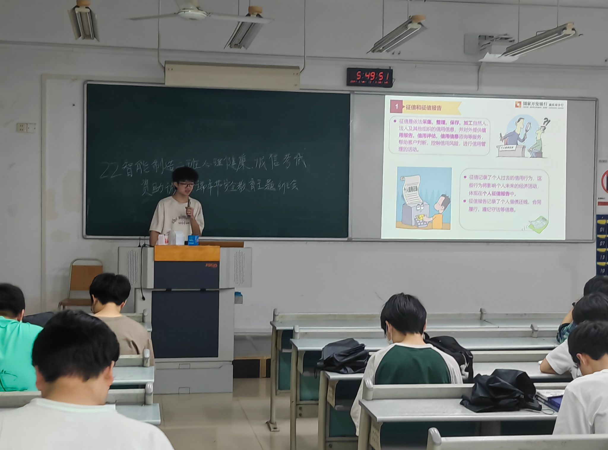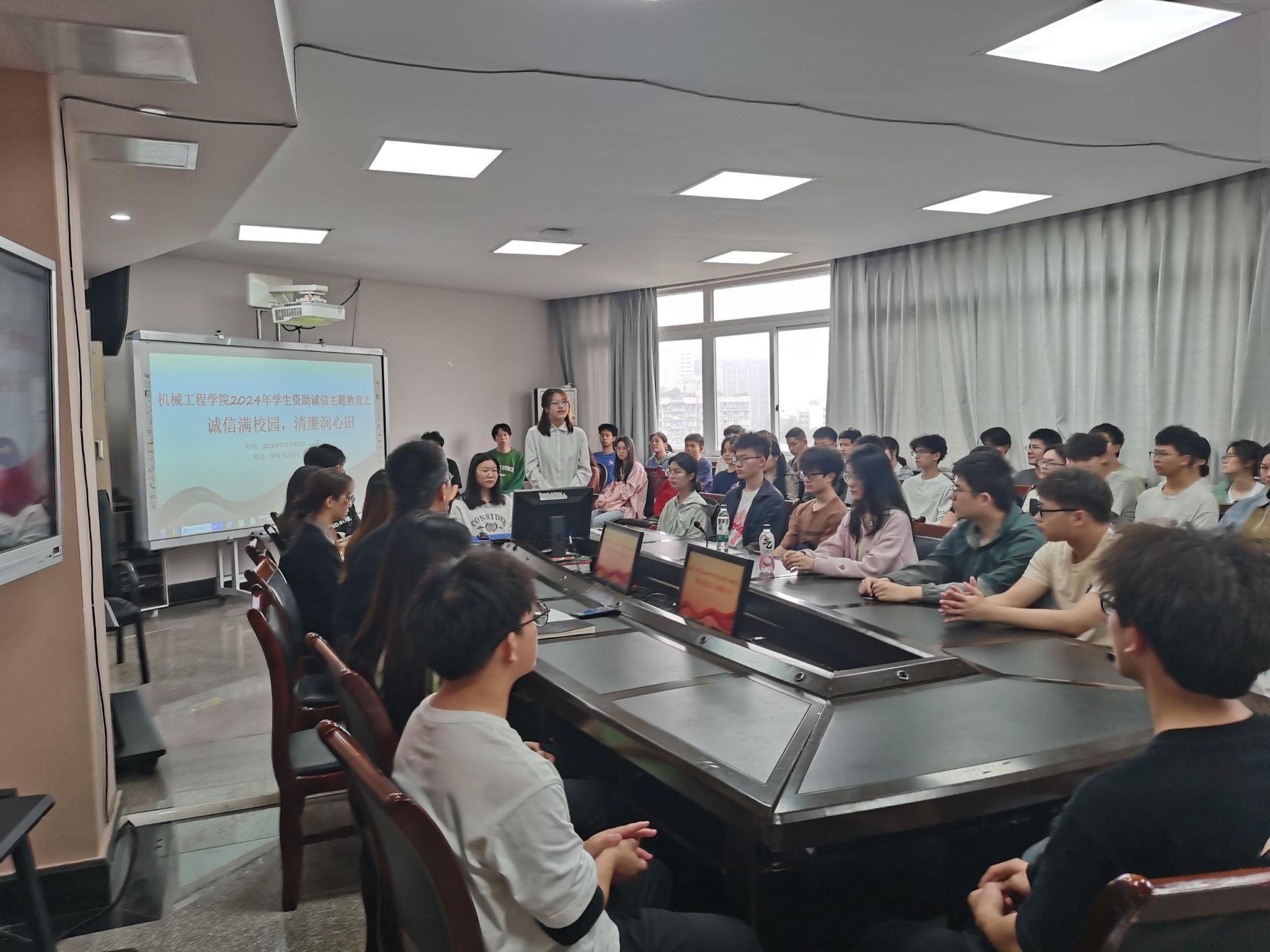 随后,陈春洁从感恩、诚信、清廉三个方面开展教育。首先,他强调同学们作为国家多年以来资助政策安排的直接受益者,应懂得知恩、感恩和报恩,每一年,国家安排财政资金直接资助700多亿元,安排助学贷款贴息100多亿元,安排临时困难补助和各种项目资助也是不小的数目,党和国家这种种的制度安排,保证了每一同学不因为资金困难而错过可以接受的高等教育。各位同学应懂得感恩党和国家的资助,助力了大家更好地发展与成长,更希望大家未来能传递这种恩情,切实落实感党恩、听党话,跟党走!其次,作为机械工科员工,要结合学科专业特点,树诚信意识,一步一个脚印诚实守信地走好职业生涯路,特别强调诚信、责任和担当这三个机械工程伦理的关键词,同时提醒有助学贷款的毕业生,要做到诚信还贷,共同打造诚信校园!最后,陈春洁着重给同学们强调了廉洁文化建设的必要性和重要性,引导同学们从现在开始、从身边事开始提高廉洁认识,积极将廉洁文化教育纳入自身成长成才全过程,踏实做事,清廉做人。