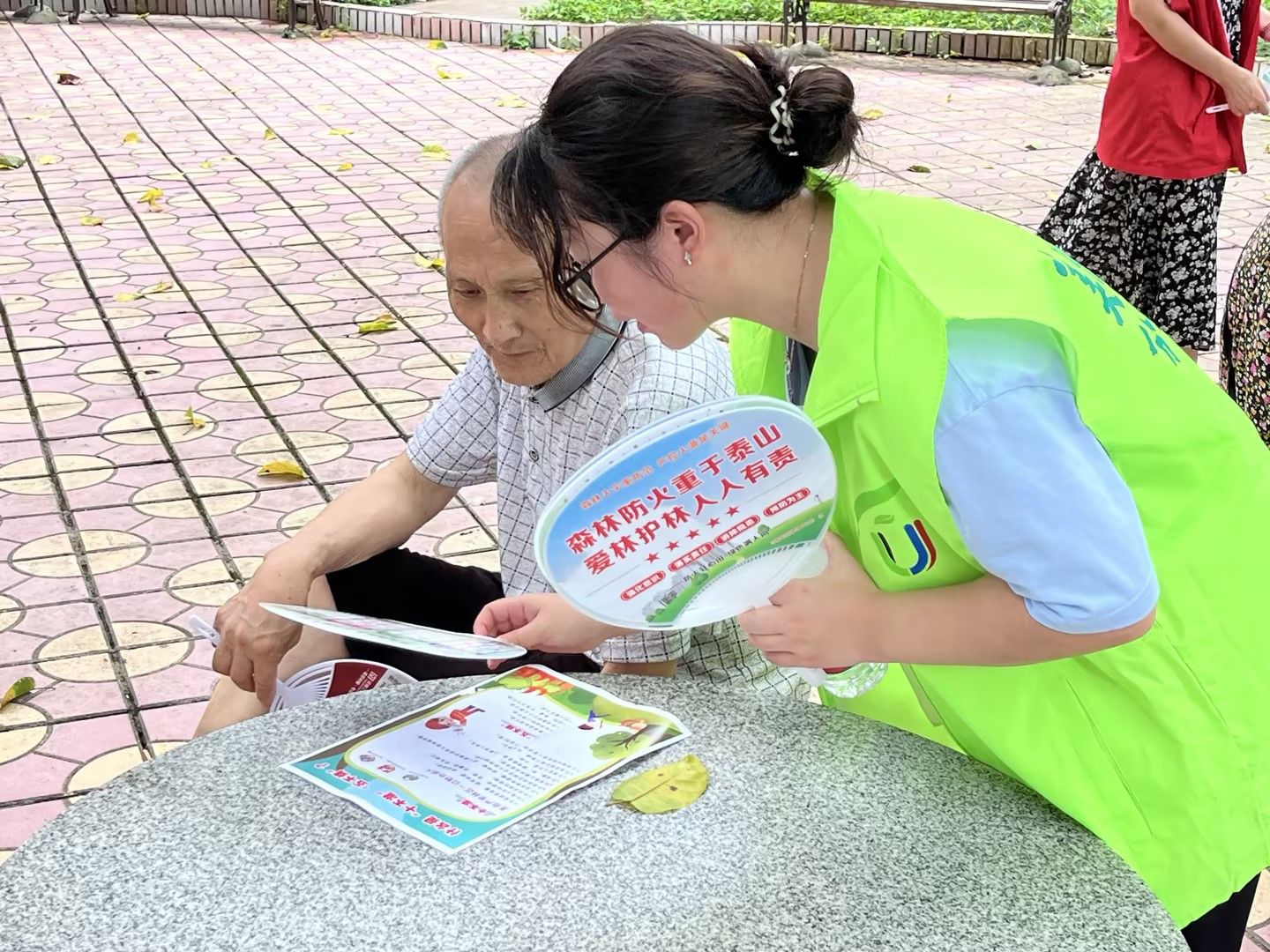 为了让防火知识更加接地气、入人心,实践团还巧妙地将知识融入日常用品之中——那些精美的森林防火扇子,在炎炎夏日里不仅带来了凉爽,更在每一次扇动间,将防火的种子播撒进了每个人的心田。居民们在享受清凉的同时,也潜移默化地增强了防火意识,学会了如何在日常生活中守护这片绿色。