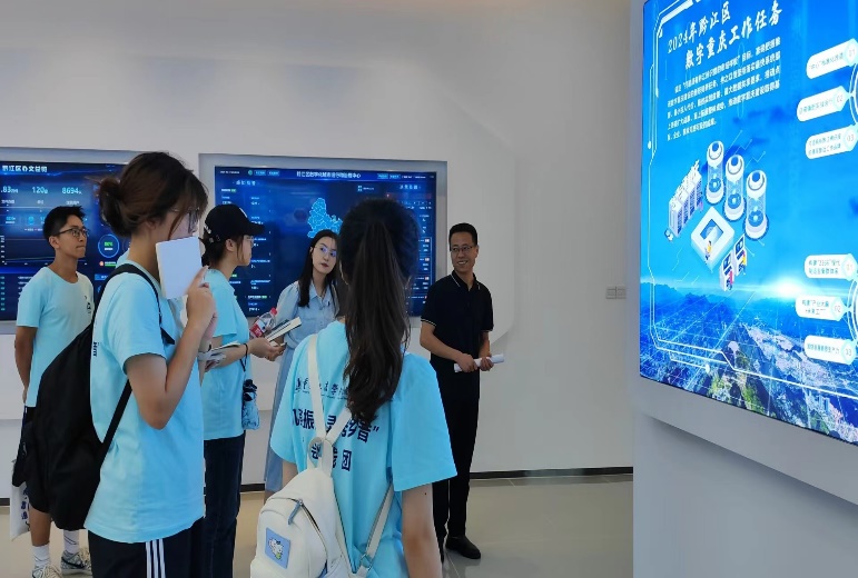 怀揣一颗求知之心,实践团成员们走进了黔江区数字治理中心,数字治理中心主任田飞热情接待了他们。在讲解员的带领下,实践团员们首先了解到数字化治理为社区工作带来的便捷——对全局的“掌控性”,对政令的“速达性”,对执行的“贯彻性”,对监督的“全览性。凭借着这些优势,工作人员们得以高效且完善的处理社区工作。“工欲善其事,必先利其器”,社区问题在得到工作人员们的妥善解决后,黔江区的发展也因此得到了推动,实现了以数字化资源推动地区进步。