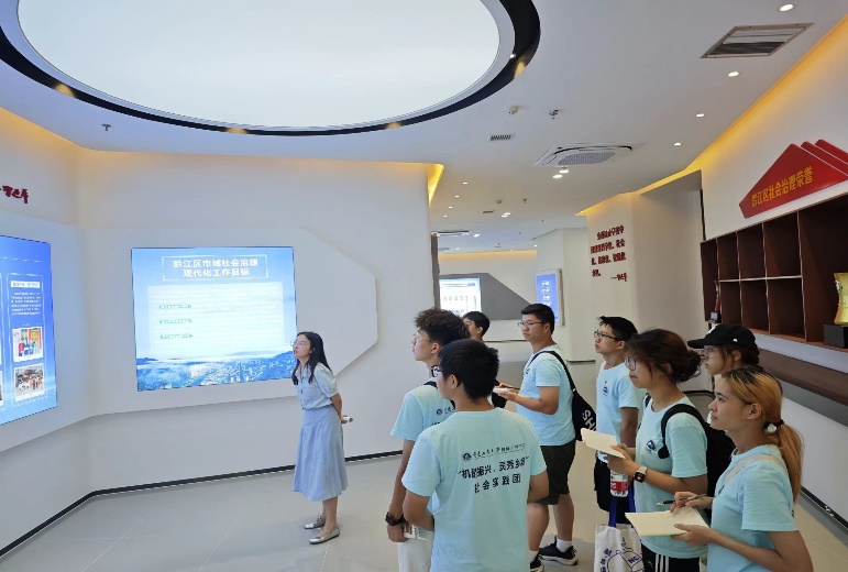 紧接着,讲解员就数字治理中心的治理体系和治理能力现代化进程为实践团成员们进行讲解。她从社区治理联动化、边区治理高效化、居民安全重视化等方面,从地区的治理到居民安全保障,深入浅出的介绍了数字治理在这一系列工作中展现的优势——及时性、高效性、共享性,黔江区也以这些资源建立起了一个高效率的数字化治理体系,在为社区的工作中发光发热。