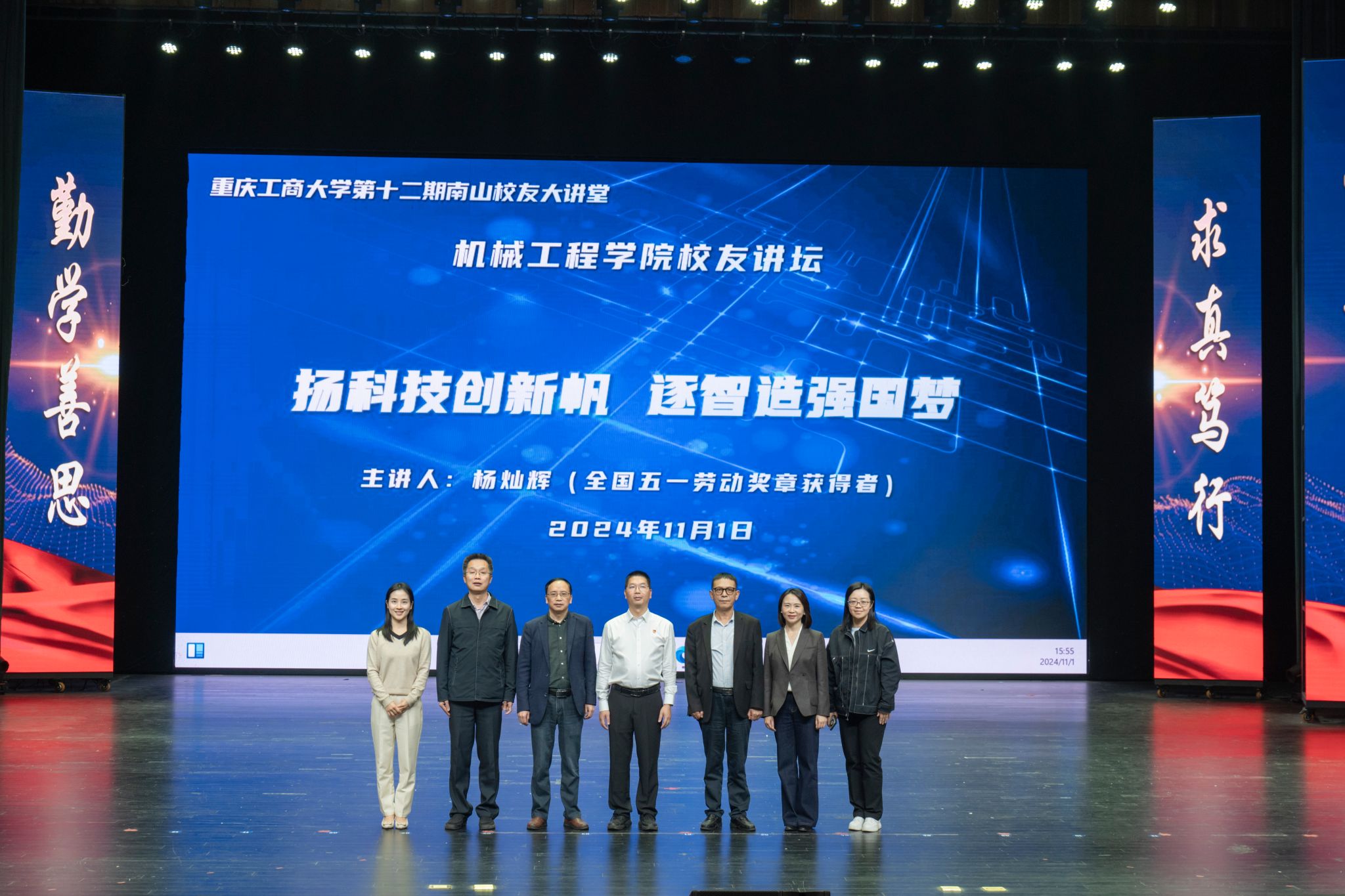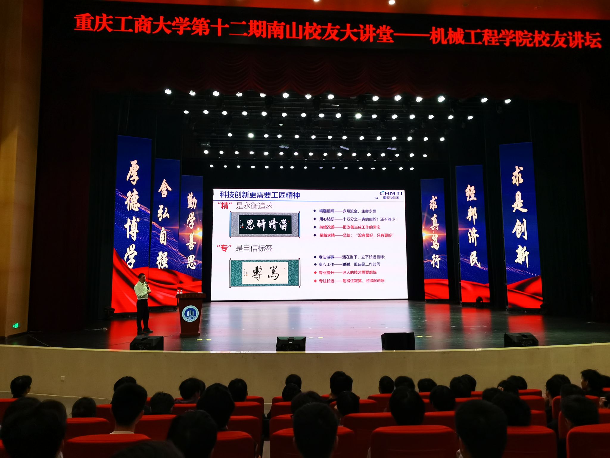 员工杨灿辉系公司1999级机械制造工艺与设备专业本科毕业,现担任重庆机床集团副总工程师。他和团队一直致力于高档数控机床及自动化等领域关键技术的研究,先后承担国家科技重大专项、国家重点研发计划、重庆市科技攻关项目10余项,开发了国内首台套大型全数控滚齿机、高精度蜗轮母机等10余款达到国际先进水平的高档数控制齿机床,填补国内空白,实现进口替代,为我国高端工业母机的发展作出贡献。“成功路上没有捷径,唯有脚踏实地、坚持不懈”,杨灿辉在分享中谈到。有一次为了解决高精度蜗轮母机刀架传动精度问题,他和项目团队成员在实验场连续攻关7个昼夜,最终成功解决了高精度蜗轮母机和大型数控滚齿机床的“卡脖子”技术难题。