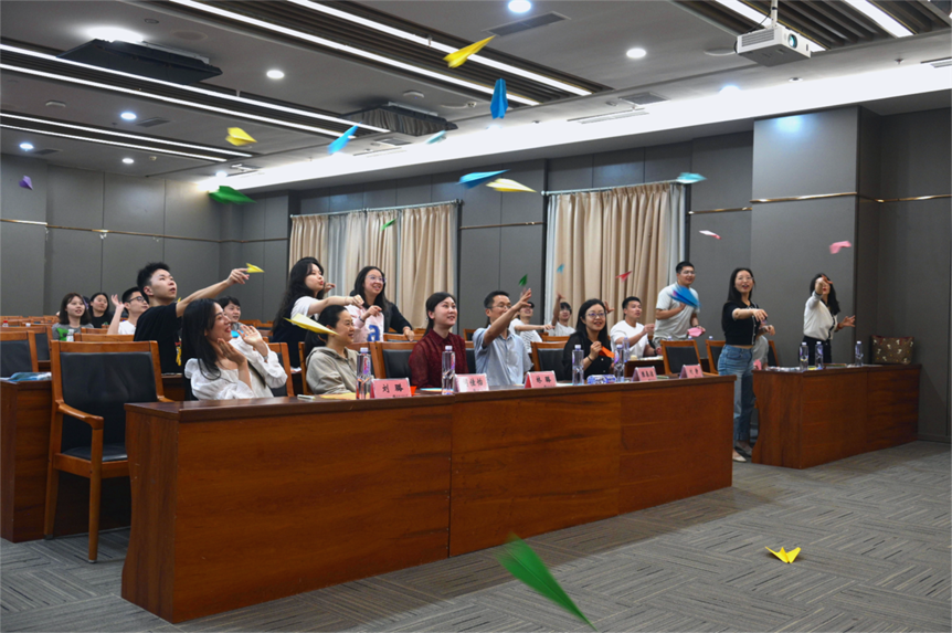 在首个环节 ——“放飞压力纸飞机” 中,同学们将近期的压力与烦恼书写在纸上,折成纸飞机放飞。随着纸飞机的腾空而起,现场氛围逐渐轻松,同学们真切感受到内心压力的释放,为后续活动奠定了舒缓的基调。随后,在抽奖环节,领导与老师们随机抽取纸飞机上的姓名,为幸运同学送上惊喜。这一环节不仅延续了压力释放的轻松氛围,更让同学们在欢笑中收获了意外的快乐,现场掌声此起彼伏。