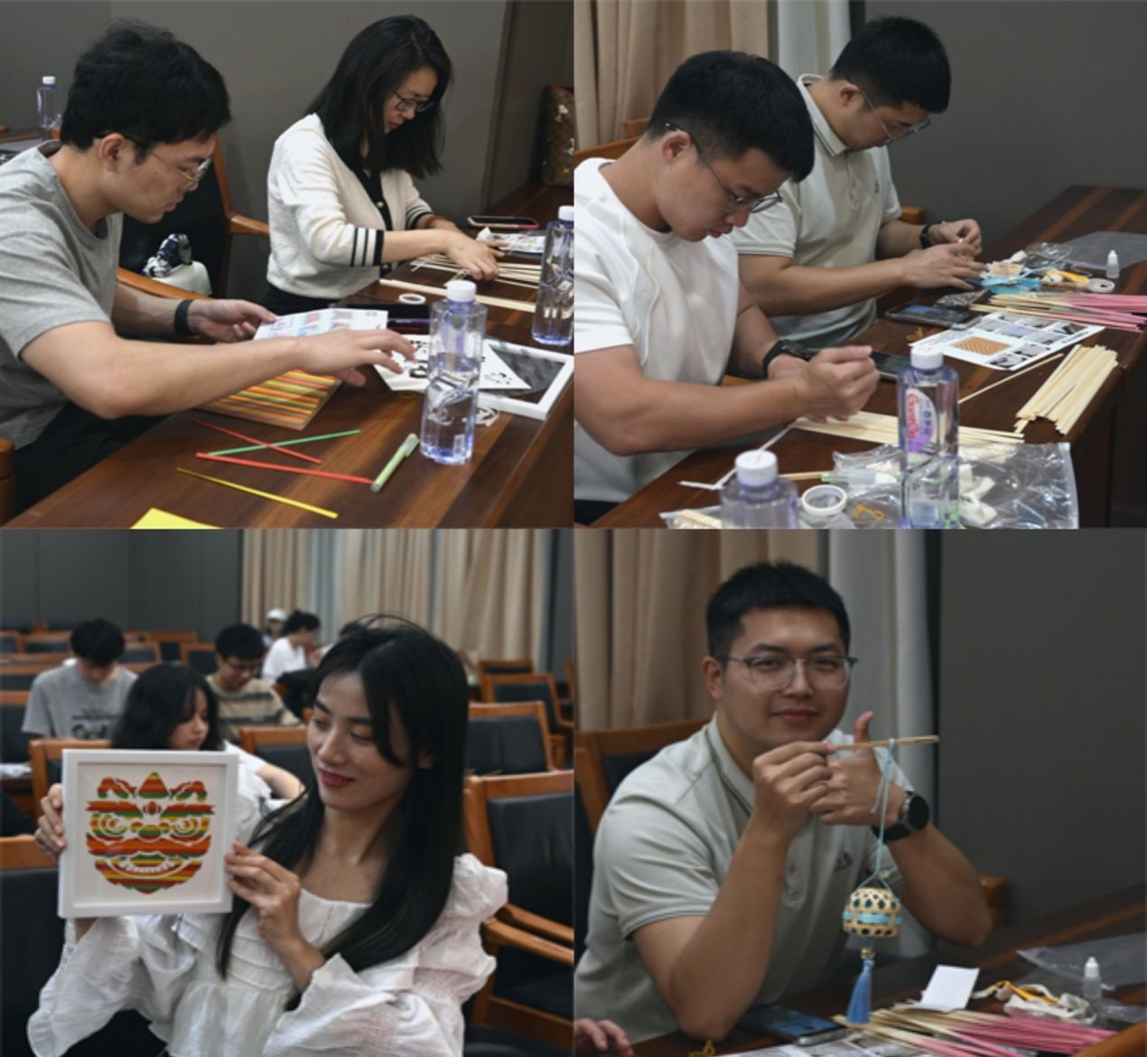 作为活动的核心环节,竹编制作在柔和灯光与舒缓音乐中展开。老师、同学们利用竹编材料包随心创作,专注于竹条的经纬编织。在重复而有节奏的编织过程中,焦虑情绪逐渐被平静取代,竹丝的温润触感与完成作品的成就感,共同构建了自然的心理调节机制。现场一件件独具匠心的竹编作品,不仅是传统文化的现代表达,更成为师生传递文化自信与心灵能量的载体。