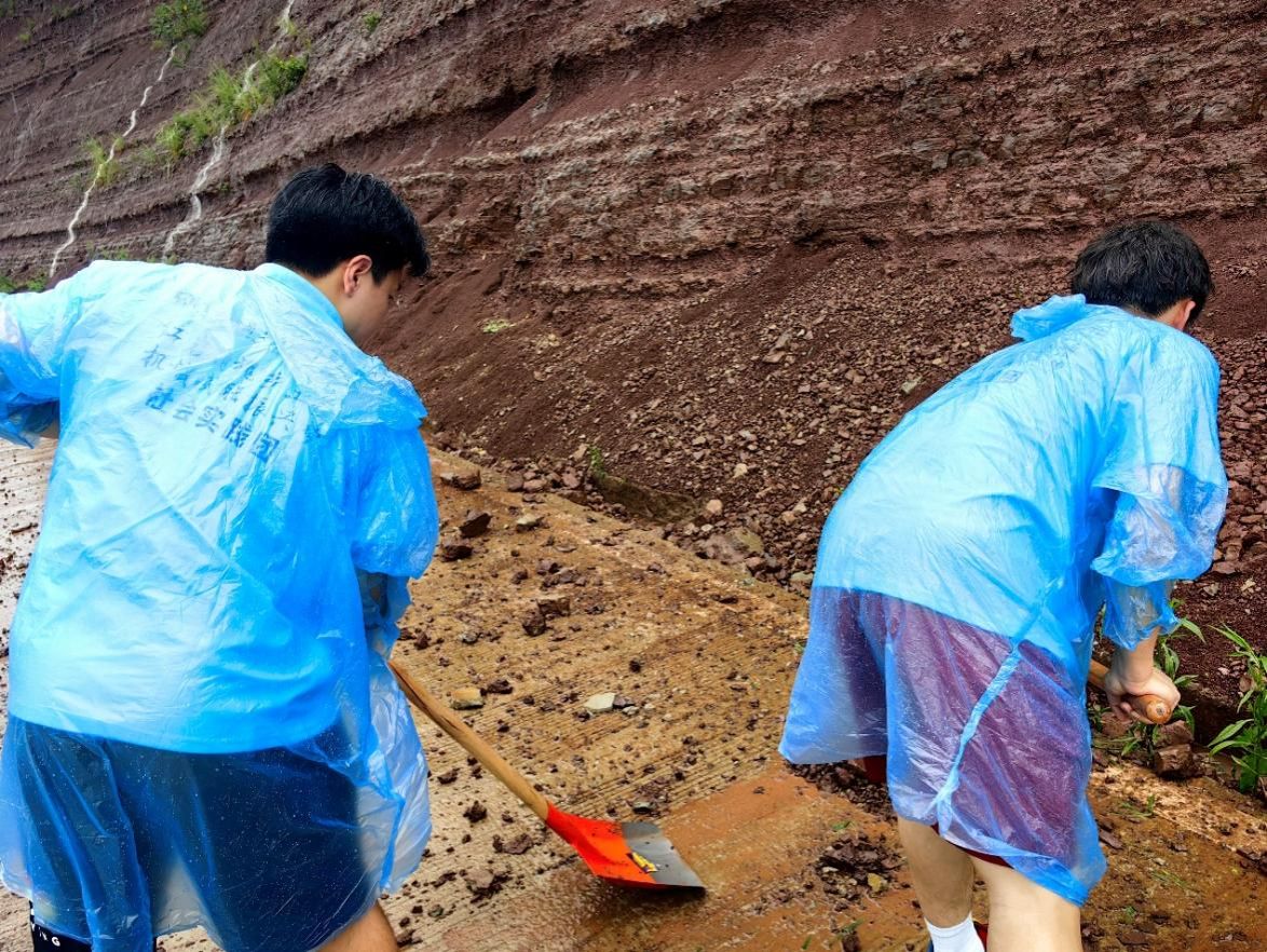 7月9号中午,同学们与白溪社区书记及当地村民一同来到落石路段。眼前的景象让人揪心,大小不一的石块散落一地,有些还夹杂着泥沙,整个路面一片狼藉。大家迅速从社区借来铲子等工具,投入到清理工作中。陈源、杨竣然、徐振超和书记、村民们一起,有的拿着铲子奋力铲除路面上的碎石和泥沙,铲子与地面碰撞发出 “叮叮当当” 的声响,奏响了抢险的序曲;有的则合力搬运稍大些的石头,累得满头大汗也顾不上擦。