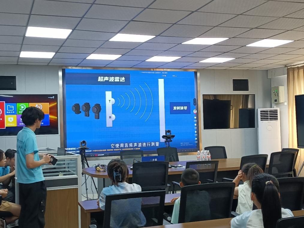 在激烈的问答环节结束后,廖崇瑞同学给小朋友们详细介绍了普通车和智能车的差别,尤其着重讲解了智能汽车的雷达系统,从工作原理到实际应用,让小朋友们深入了解到雷达如何帮助智能汽车实现自动避障、自适应巡航等功能,感受到科技为出行带来的便利与安全。而这些由科技赋予的智能功能,除了让出行更顺畅、更安心,还在悄悄为环保贡献力量——正是因为雷达等技术让车辆行驶更精准高效,才为节能减排打下了基础。在智能汽车环保方面,团队成员向小朋友们讲解了智能汽车在节能减排、降低环境污染上的优势,让他们明白科技创新不仅能提升生活品质,还能保护地球家园。