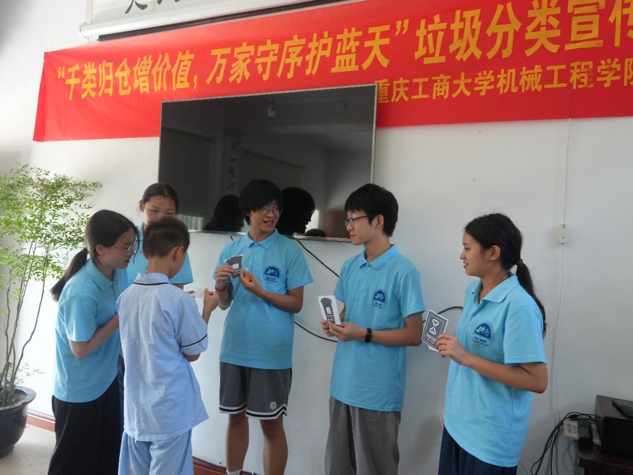 为增强活动趣味性,团队设计了“垃圾分类大赛”等互动环节。在游戏中,小朋友们通过模拟垃圾投放赢取环保小奖品。同时在后续的活动中团队成员还将会通过使用废弃的材料去制作动能小车,让小朋友们切身的体会到垃圾也可以废物利用。通过这种趣味性的活动小朋友们也可以对垃圾分类的知识有更加深刻的记忆。“可回收,变宝贝;有害物,单独放;厨余渣,化肥料;其他品,妥安放。”这是实践团成员告诉小朋友的小秘诀。