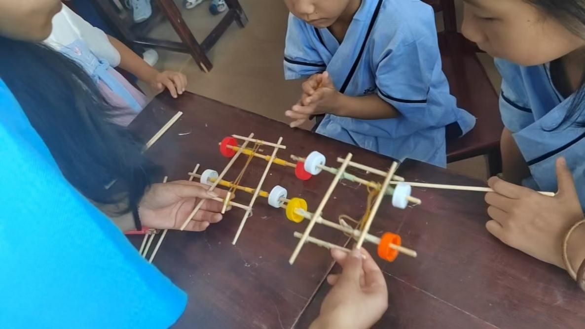筷子搭桥承重实验区同样吸引了不少小朋友们的目光。老师先介绍了桥梁的基本结构和承重原理,然后示范了用筷子搭建桥梁的方法。小朋友们分成小组,纷纷拿起筷子和橡皮筋,开始搭建属于自己的 “桥梁”。大家相互讨论、协作,不断调整桥梁的结构,试图让它能够承受更重的重量。当看到自己搭建的筷子桥成功撑起多本书时,大家都欢呼雀跃。这个实验不仅让小朋友们了解了结构力学的基本知识,还培养了大家的团队协作能力和创新思维。
