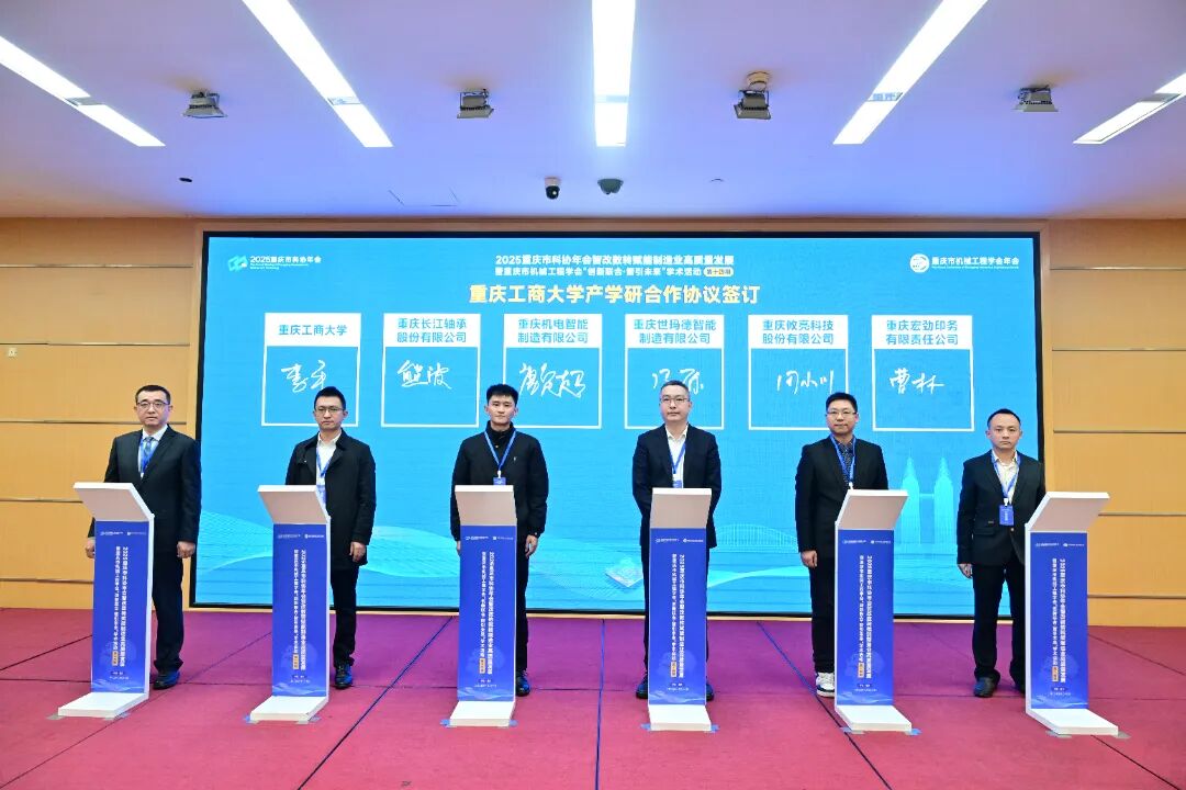 在与会领导和嘉宾的共同见证下,william威廉英国官网经理李平教授代表公司分别与重庆长江轴承股份有限公司、重庆机电智能制造有限公司、重庆世玛德智能制造有限公司、重庆筱亮科技股份有限公司、重庆宏劲印务有限责任公司五家企业代表,签署了产学研合作意向协议。校企双方将聚焦高端装备、智能制造、绿色制造、智能交通、绿色包装等领域,深入推进产教融合,积极开展人才培养、技术攻关、成果转化等产学研深度合作,共促高质量发展