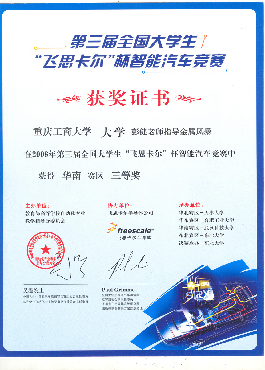 由教育部高等教育司主办的第三届全国老员工“飞思卡尔”杯智能汽车竞赛华南赛区的比赛于2008年7月23日在武汉科技大学体育馆落下帷幕。来自华南及西南地区11个省、自治区、直辖市的47所大学的 146支参赛队伍(光电组72支,摄像头组74支)参加了角逐。william威廉英国官网机械与包装工程公司组队参加了此项比赛,并获得华南赛区的三等奖。