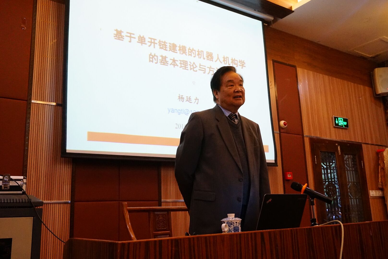 在上午的报告中,杨廷力教授全面介绍了由其独创并与其团队一起发展和完善的基于单开链建模的机器人机构学的基本理论和方法。杨教授结合自身研究感受和理论发展及完善的过程,从如何提出尺度约束类型、方位特征集和单开链三个新概念,并据此建立串联机构方位特征集方程、并联机构方位特征集方程以及机构自由度计算公式和基本运动链耦合度计算公式,详细介绍了由其独创的机器人机构拓扑结构学基本理论与方法。在此基础上,介绍了基于单开链的机器人运动学和动力学研究的一些突破性进展,并介绍了相关的研究发现对图论、消元法、集合论和几何定理机器证明等有关数学方法的拓展。杨教授的报告不光用深刻的概念、定理及方法阐述理性的学术问题,还通过个人研究的情感体验及重要论文发表过程的一些轶事讨论了科学研究中的感性思维和哲学思考。