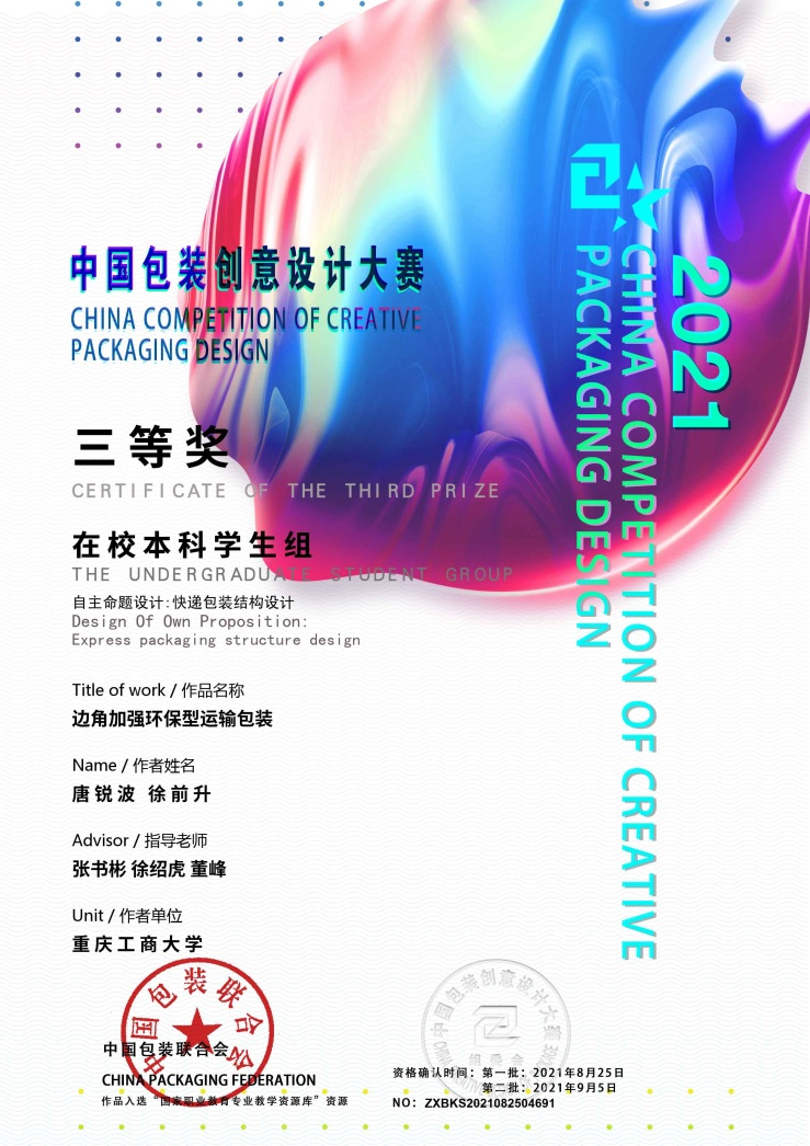 包装创意设计大赛是由中国包装联合会举办,是中国包装联合会贯彻落实国务院对包装高质量发展战略和对中国包装创新创意设计发展的决策部署,是促进中国包装大国迈向包装强国的一个举措。大赛自2010年举办至今,已经连续举办了十一届,是当前中国包装行业、包装教育界、视觉平面设计教育界备受瞩目的专业竞赛活动,也是教育部、国家职业教育专业教学资源库建设的重要组成部分,员工通过参与该项比赛专业素养得到磨砺和提升,扩大了包装工程专业在专业学科竞赛方面的影响力。