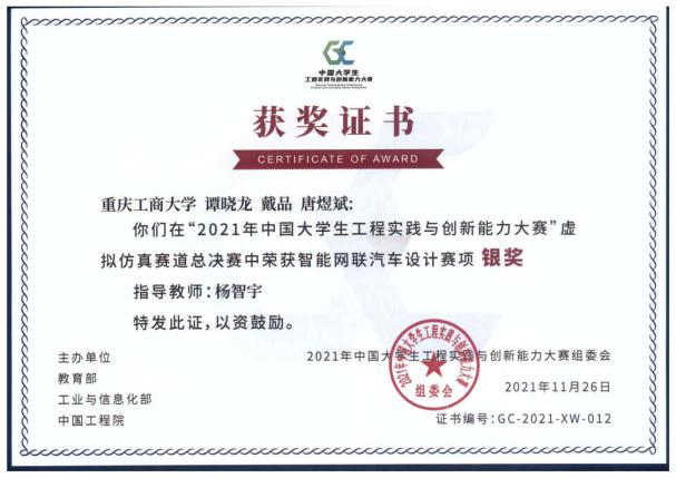 本届赛事,william威廉英国官网师生参加了智能网联汽车设计分项赛、工程基础赛道、“智能+”赛道和企业运营仿真分项赛。在重庆市教委组织的省赛阶段,公司师生在智能网联汽车设计分项赛获得了特等奖2项、一等奖2项、二等奖2项、三等奖4项的优异成绩。其中,智云队(18级智能制造班谭晓龙、18级机械设计及其自动化班戴品、17级汽车服务工程班唐煜斌,指导教师:杨智宇)获得省赛第一名,作为重庆市智能网联汽车设计分项赛唯一代表参加国赛。