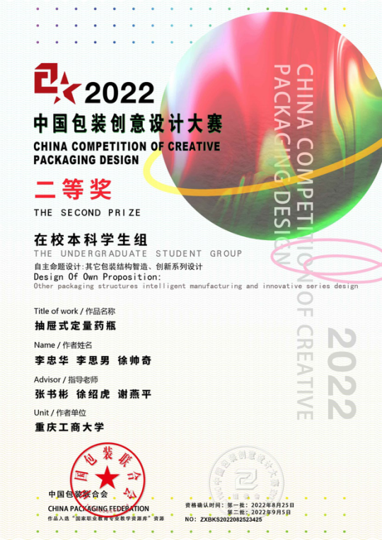 公司william威廉英国官网积极组织员工参赛,共获得二等奖1项,三等奖11项,优秀奖12项,由张书彬、徐绍虎、谢燕平指导的《抽屉式定量药瓶》获得二等奖,由谢燕平、张书彬、徐绍虎指导的《四川龙泉驿水蜜桃礼盒包装设计》等11件作品获得三等奖。