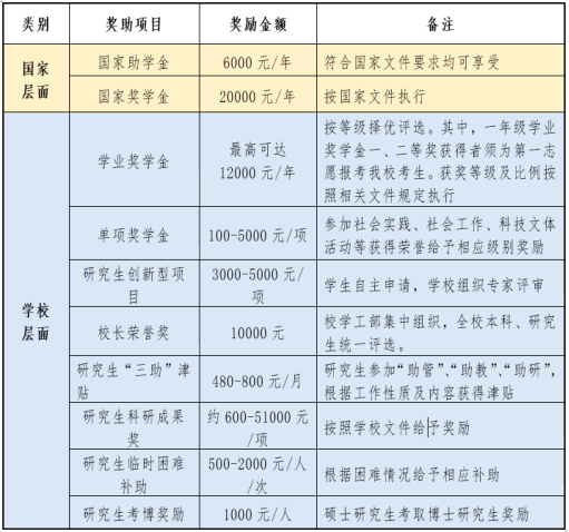 奖助学金参考下表: